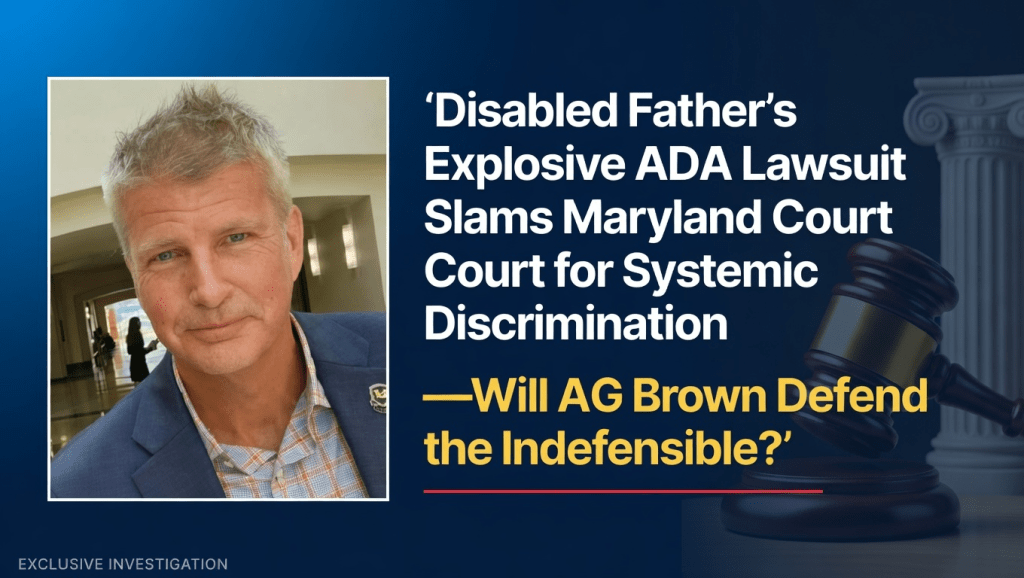 Jeff Reichert’s ADA bombshell lays bare a Maryland court system’s alleged contempt for federal protections, retaliating against a disabled father daring to demand access. As the case advances in federal court, all eyes turn to AG Anthony Brown: Will he uphold his civil rights mantle or become the shield for institutional failure?